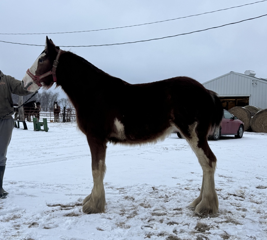 Stud colt, very heads up, will wear harness as he gets older. Tail is docked. Will be shown at the National Clydesdale Show at the Iowa State Fair in August 2024. Will be available for purchase late August.